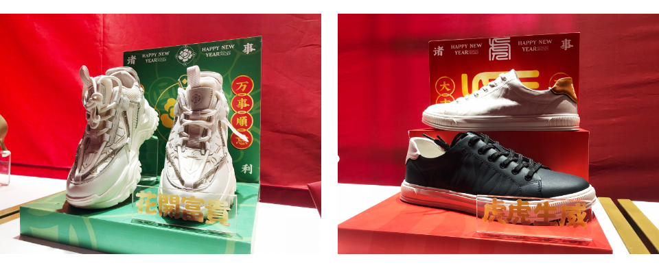 此次康奈推出的虎年开运鞋共有两款,分别是“虎虎生威”和“花开富贵”。虎虎生威鞋采用牛皮鞋面,设计上在外侧使用了虎纹压印,在后帮处采用传统篆刻“虎”字,鞋底则采用防滑鞋底横纹设计。花开富贵鞋是一款女鞋,也是当下流行的老爹鞋款。鞋面上融入了牡丹花、四方铜钱等元素,寓意新的一年日进斗金,富贵吉祥。从制造工艺来看,鞋面采用多材质拼接设计和特殊印花工艺;鞋底采用橡胶发泡厚底,轻软回弹,同时鞋的自重很轻。