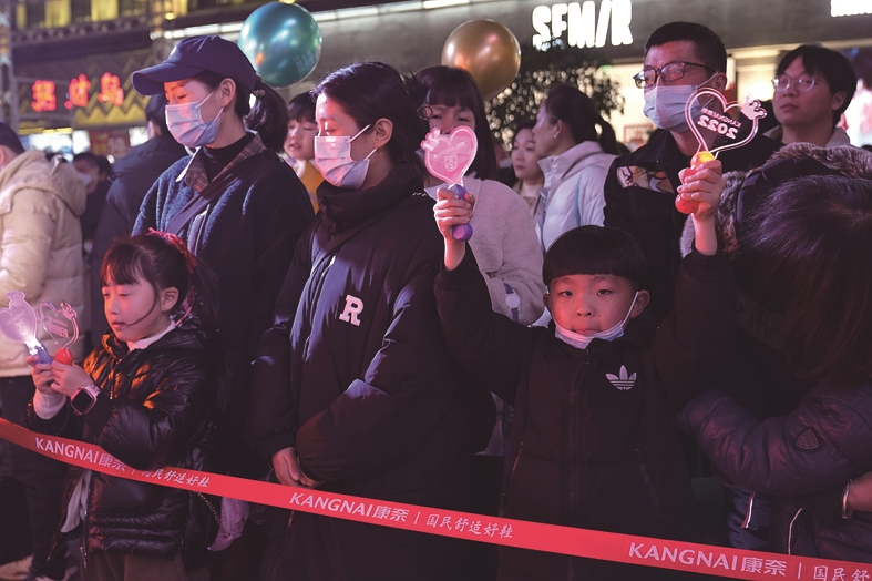 当晚,五马街欢声笑语不断。现场不仅有歌手驻场助兴,还有国潮系列走秀表演。许愿树下、冰壶游戏区、盲盒墙边,人群中不时爆发出欢呼声。线上,康奈抖音“直播间”同样人气爆棚,吸引了约20万人次在线观看互动。