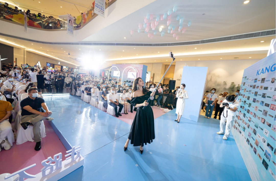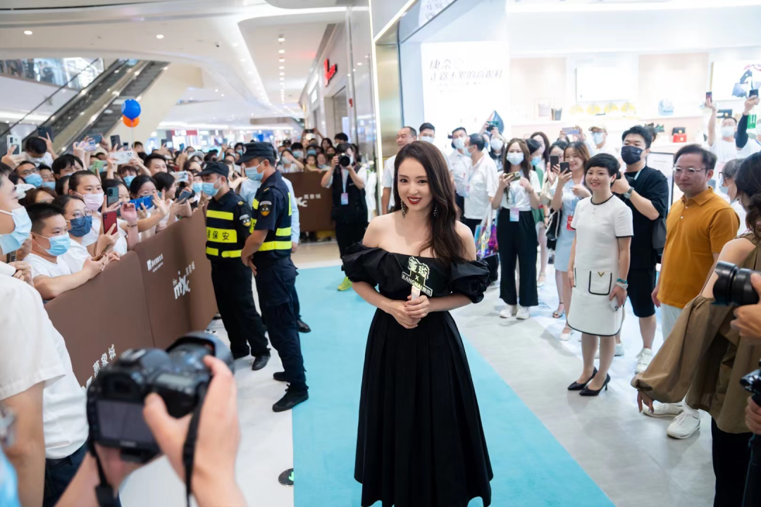 (明星董璇,温州市商务局局长彭魏滨,瓯海区委副书记、区长刘云峰,温州市商务局副局长王晓东,瓯海区副区长杜潘祚,鹿城区商务局局长李常春,瓯海区商务局局长谢东,温州万象城总经理张栩,康奈集团董事长郑莱毅和总裁郑莱莉共同启幕)