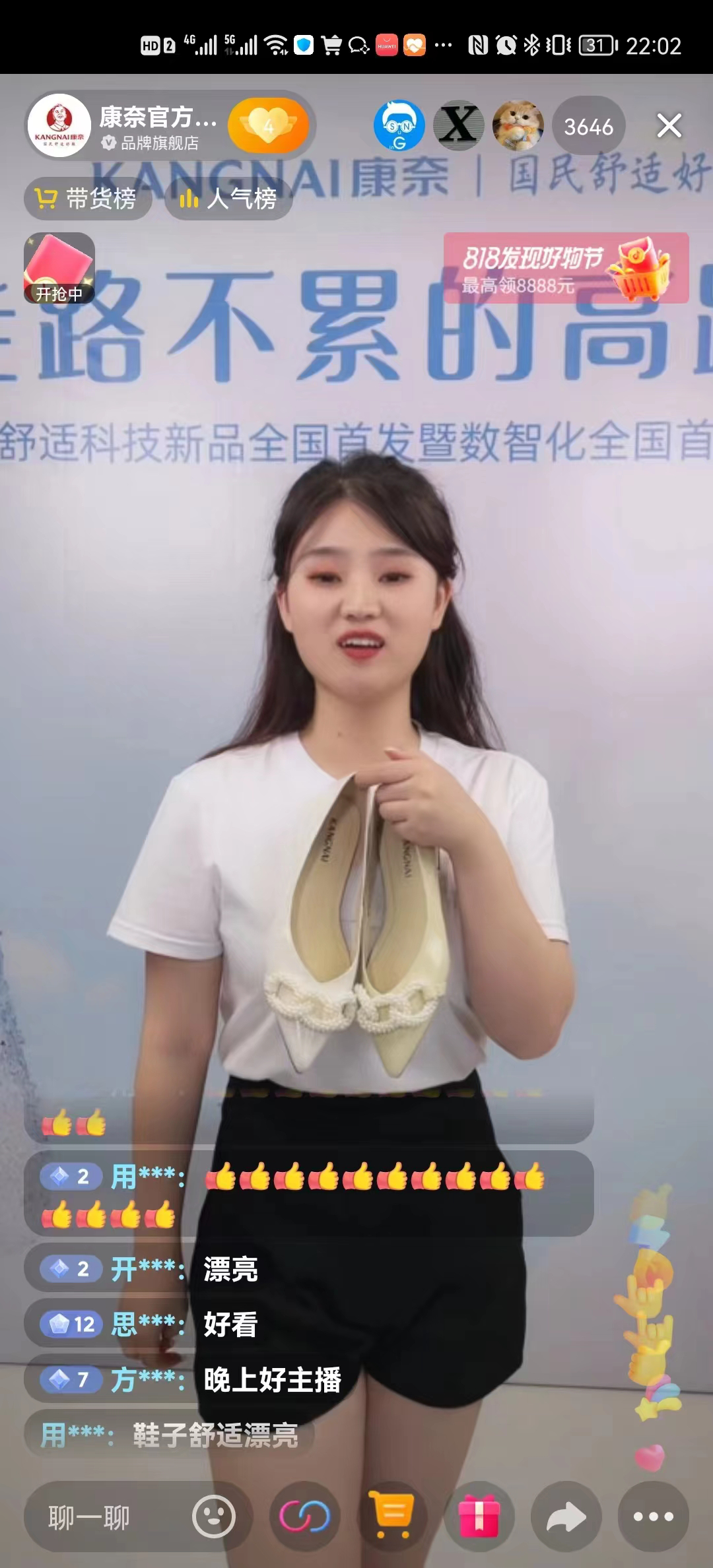 发布仪式后,郑莱莉总裁走进国内第一家官方授权的鞋靴垂类抖音电商直播基地康奈直播间,为康奈舒适科技新品直播带货。直播间的宝宝们热情互动,红包礼品不间断,直播间的人气一度冲上热搜。